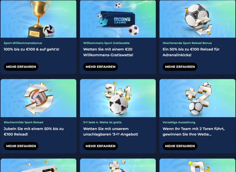 Über das Willkommensangebot hinaus bietet das Moana Casino regelmäßige Aktionen, um Ihr Spielerlebnis spannend zu halten. Das unterhält einen vollen Kalender mit Sportangeboten, die Sie unten finden: