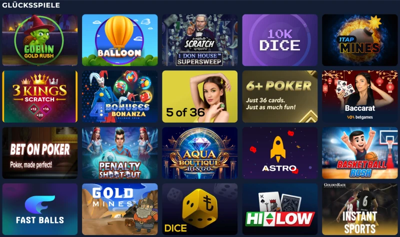 Zusätzliche schnelle Spiele wie Balloon, Dice und Hi-Low